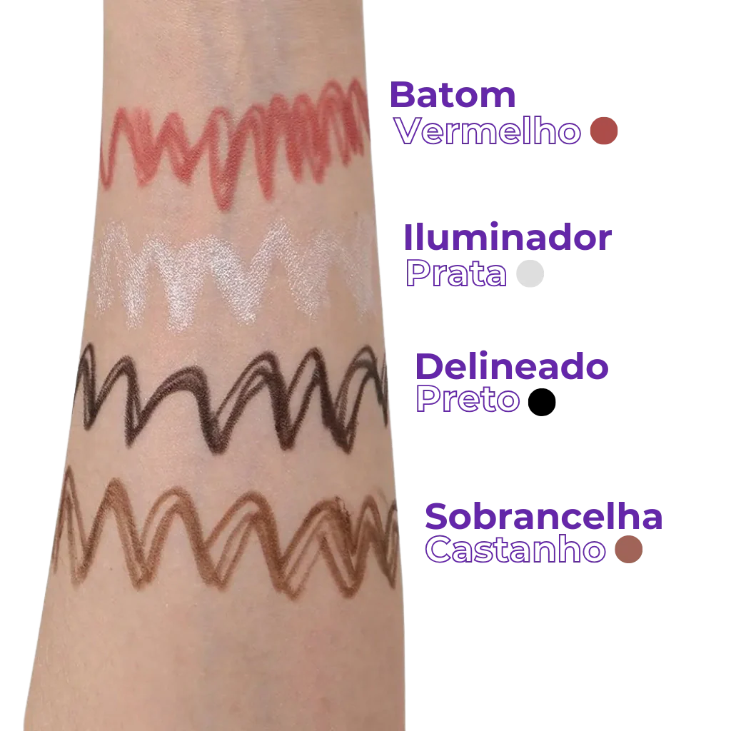 Cores: Delineador Preto, Batom Vermelho, Sobrancelha Castanho, Iluminador Pérola