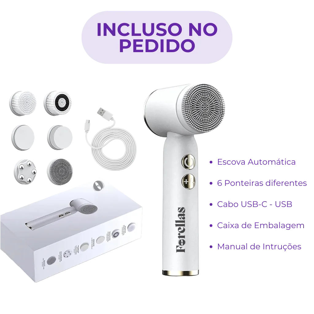 A Escova de Limpeza Facial Automática 6 em 1 Forellas combina limpeza, massagem, esfoliação e ativação da circulação em um único aparelho — ideal para quem busca praticidade e pele perfeita.