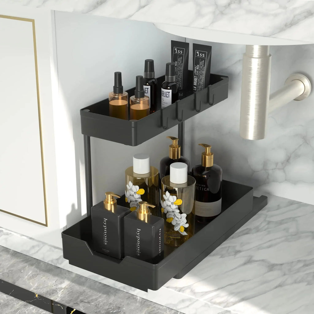 Aproveite ao máximo o espaço embaixo da pia com a Prateleira Organizadora Deslizante de 2 Níveis em L! Esta prateleira inovadora é perfeita para organizar seus utensílios de cozinha, produtos de limpeza e muito mais.